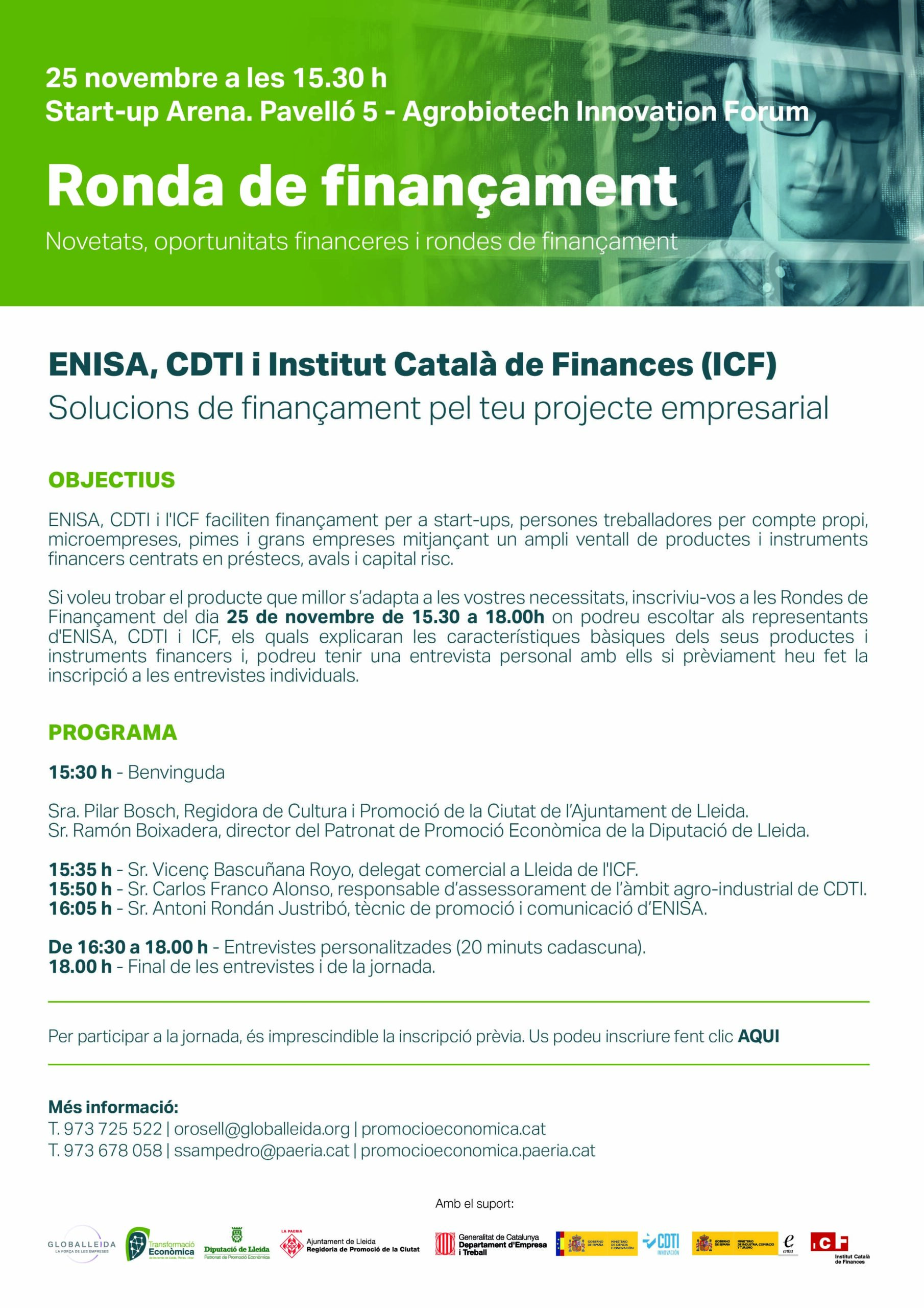Ronda de finançament – 25/11/2025 RONDA DE FINANÇAMENTNovetats, oportunitats financeres i rondes de finançament. Dia: 25 de novembre de 2025.Hora: 15.30 hUbicació: Sala Polivalent de la Diputació de Lleida. Descarrega aquí més informació INSCRIU-TE!